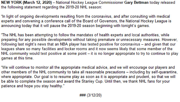 Nhl News League Announces Policy For Players During Pause In Schedule